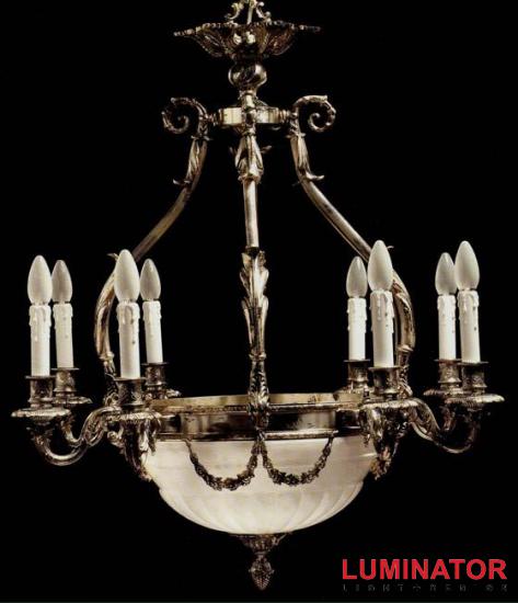 Люстра фабрики Badari Lighting выполнена из состаренного металлического основания оттенков серебра, оформленного плафоном из алабастра.