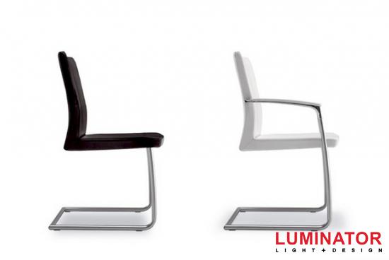 Обеденный стул на ножке-петле из матового металла. Полокотники из полированного алюминия с элементами из массива итальянского ореха, бука, кожи.