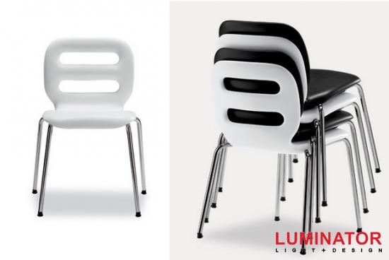 Штабелируемый (до четырех штук) стул без подлокотников, каркас из инновационного мягкого материала низкой плотности. Ножки выполнены из металла. Мягкое сиденье с наполнителем из ППУ.