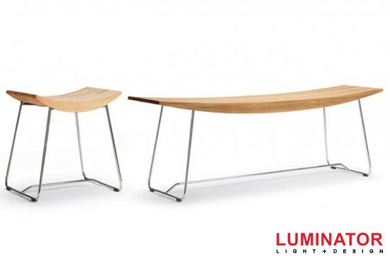 Скамейка и низкий стул с твердым сиденьем из древесины дуба и бука. Металлический каркас из полированного хрома.