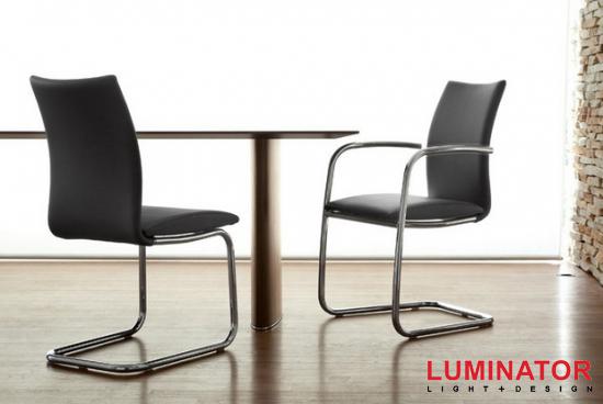 Стул с подлокотниками на ножке-петле из хромированной стали. Стационарная или съемная обивка из кожи, текстиля, микрофибры.