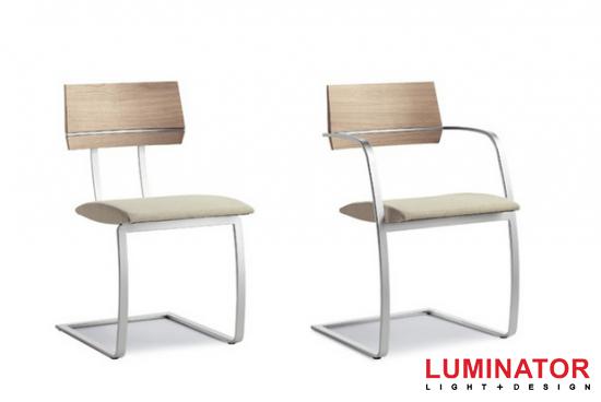 Столовый стул на ножке-петле из хромированной стали. Сиденье и спинка из ламинированного массива дуба или бука. Возможна обивка из кожи, текстиля или микрофибры.