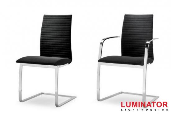 Стул с подлокотниками на ножке-петле из хромированной стали. Стационарная или съемная обивка из кожи, текстиля, микрофибры.