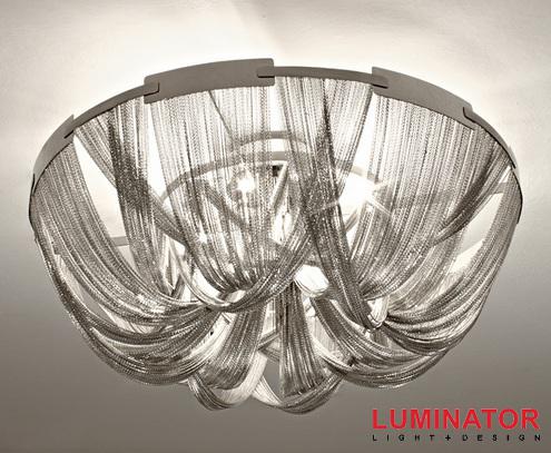 Потолочный светильник. Каркас выполнен из металла и декоративно оформлен тонкими ювелирными цепочками. Светильник доступен в никеле или бронзе. Фабрика предлагает модель разных размеров: диаметр 72см, 100см, 145см.