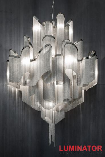 Подвесной светильник. Каркас выполнен из металла и декоративно оформлен тонкими ювелирными цепочками в никеле. Фабрика предлагает модель двух размеров: диаметр 80см, 110см.